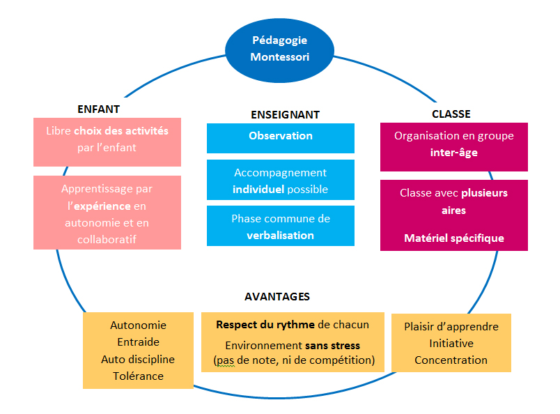 Cette méthode s’adresse particulièrement aux élèves de maternelle et primaire. Les classes réunissent des élèves d’âges différents : 3-6 ans, 6-9 ans, 9-11 ans. Les grands sont des mentors pour les petits.